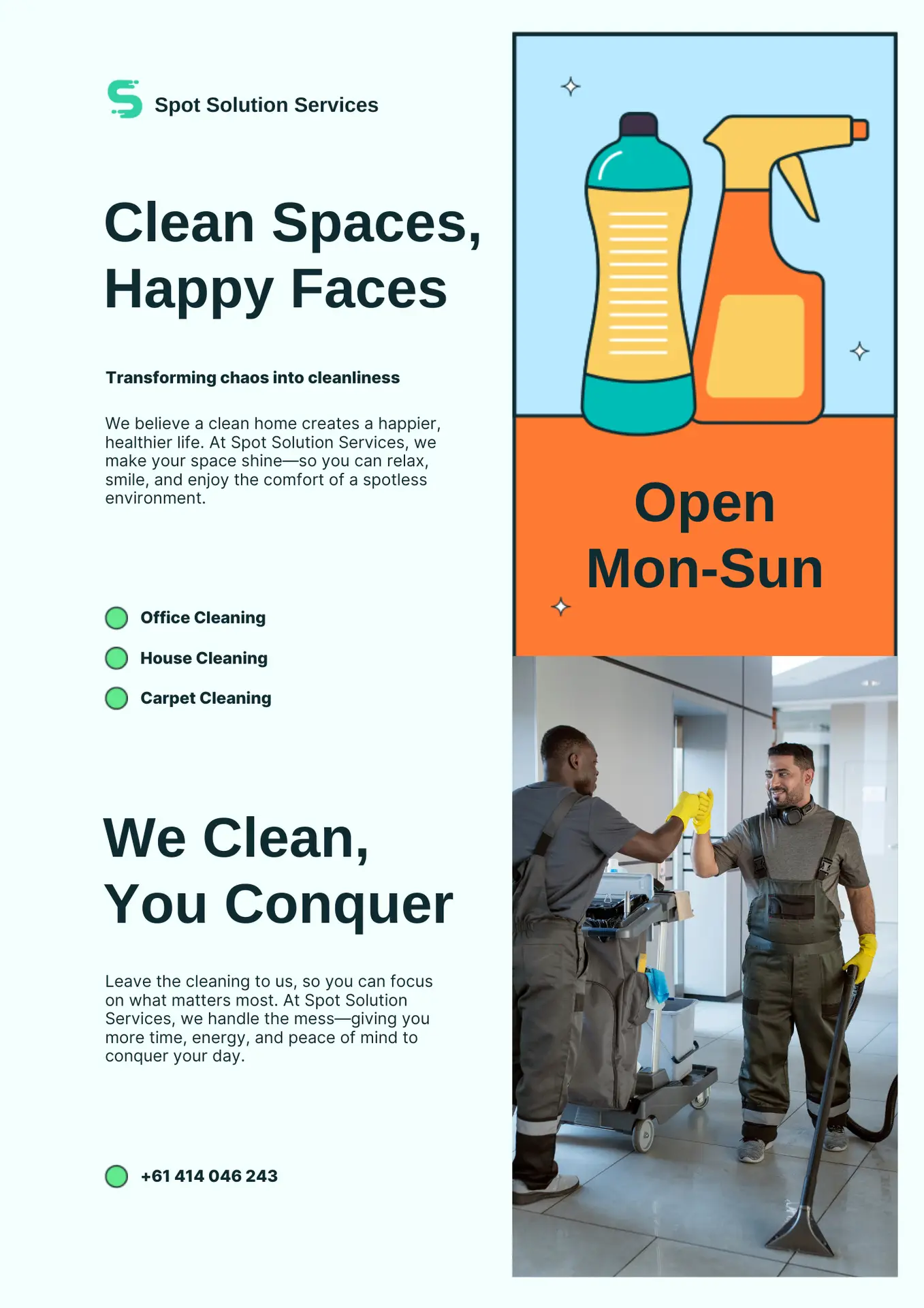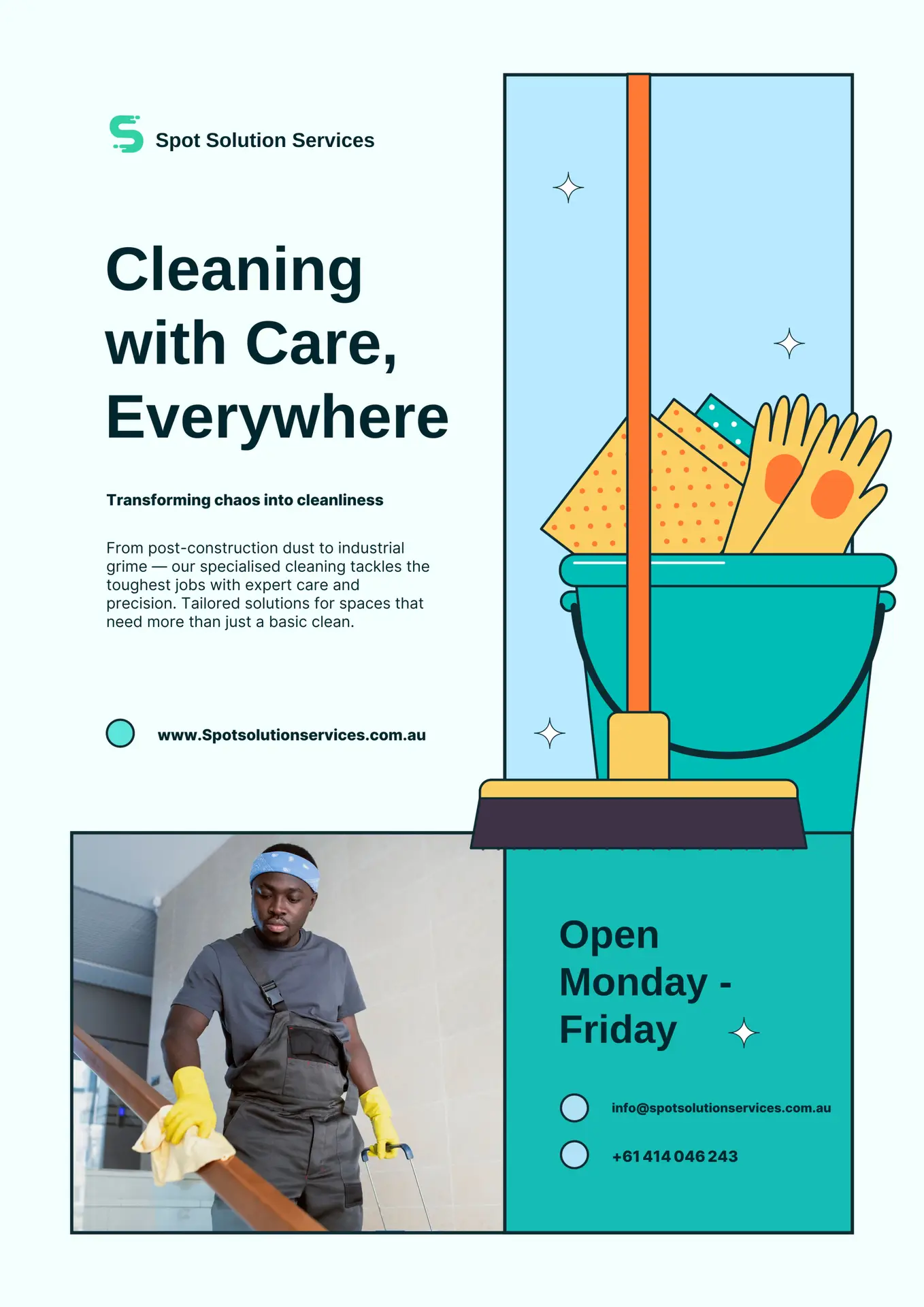 Not every clean is routine — and that’s where we come in. At Spot Solution Services, our specialised cleaning tackles complex, high-demand jobs with precision and expertise. From post-construction sites and industrial facilities to event venues and pressure washing, we deliver tailored solutions for spaces that need more than just the basics. Trust our skilled team to handle the toughest messes — safely, efficiently, and thoroughly.